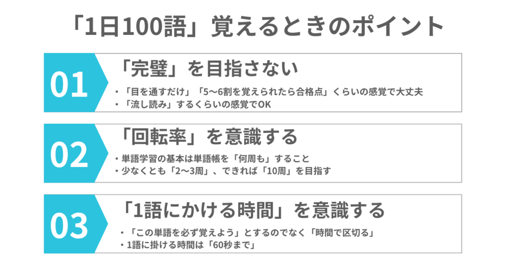 「回転率」を意識しない学習方法を選ぶのであれば、「1日100語」という量はこなせなくなってしまいます。