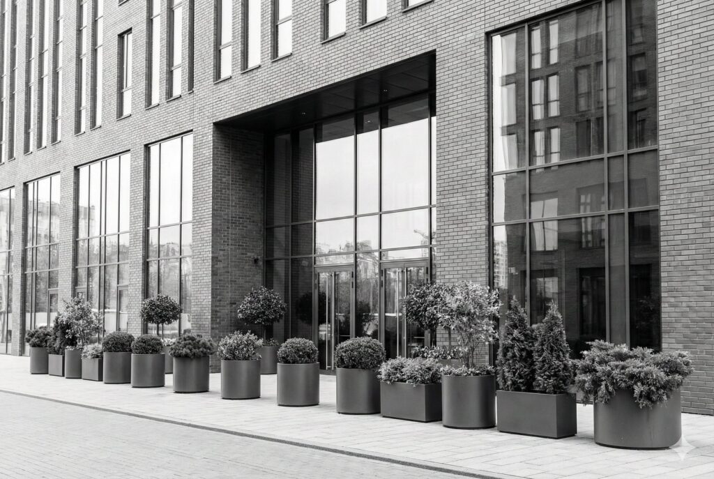 (B) 鉢植えが歩道の上に置かれている。
